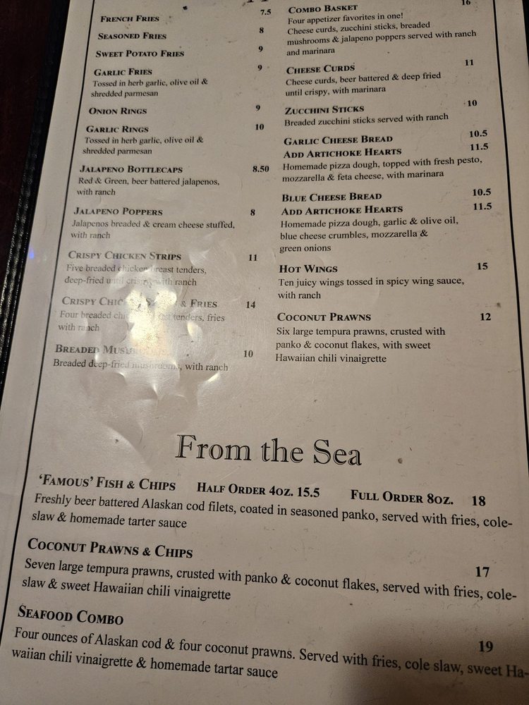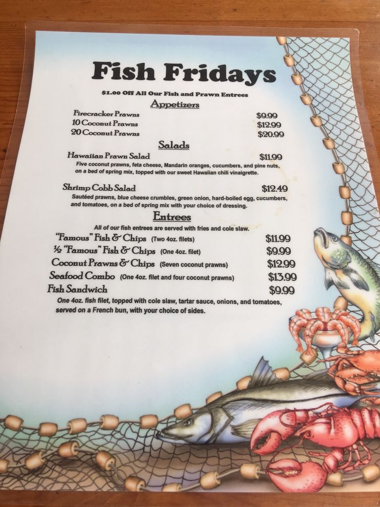 Four ounces of Alaskan cod and four coconut prawns served with French fries, coleslaw, a sweet Hawaiian chili vinaigrette, and homemade tartar sauce.