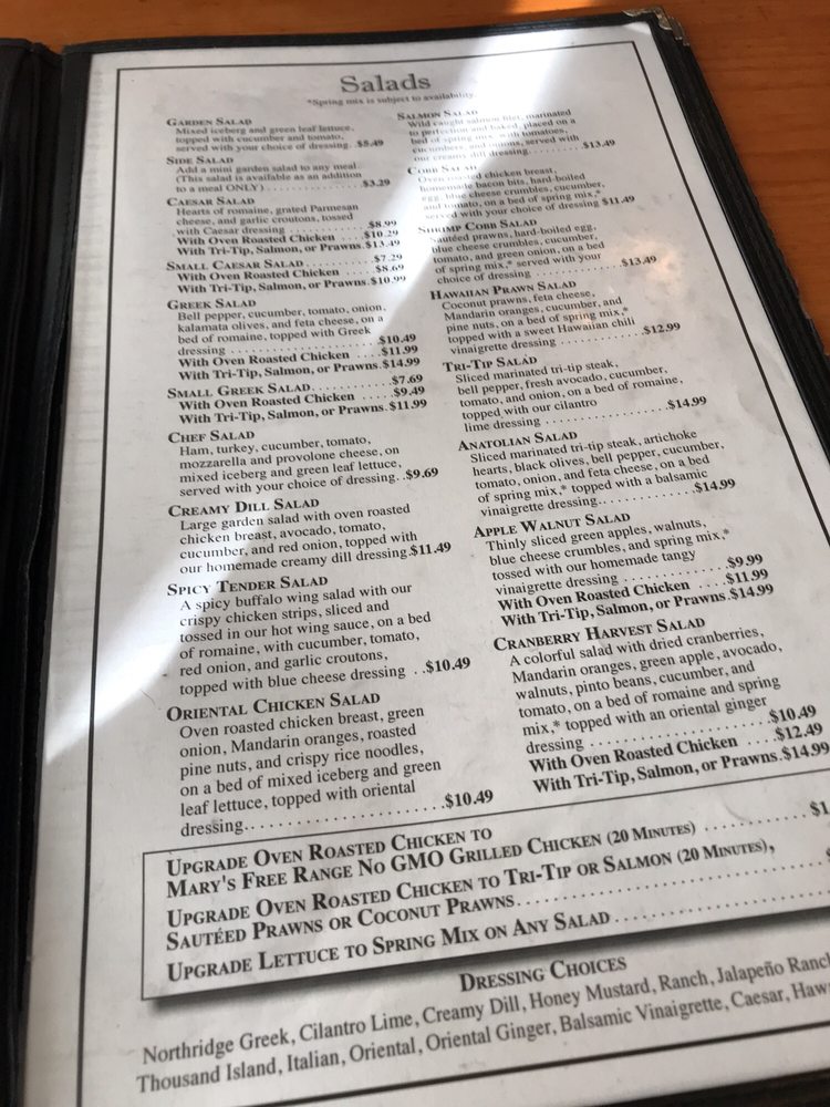 Coconut prawns, feta cheese, Mandarin oranges, cucumber, and pine nuts, on a bed of spring mix, topped with a sweet Hawaiian chili vinaigrette dressing.